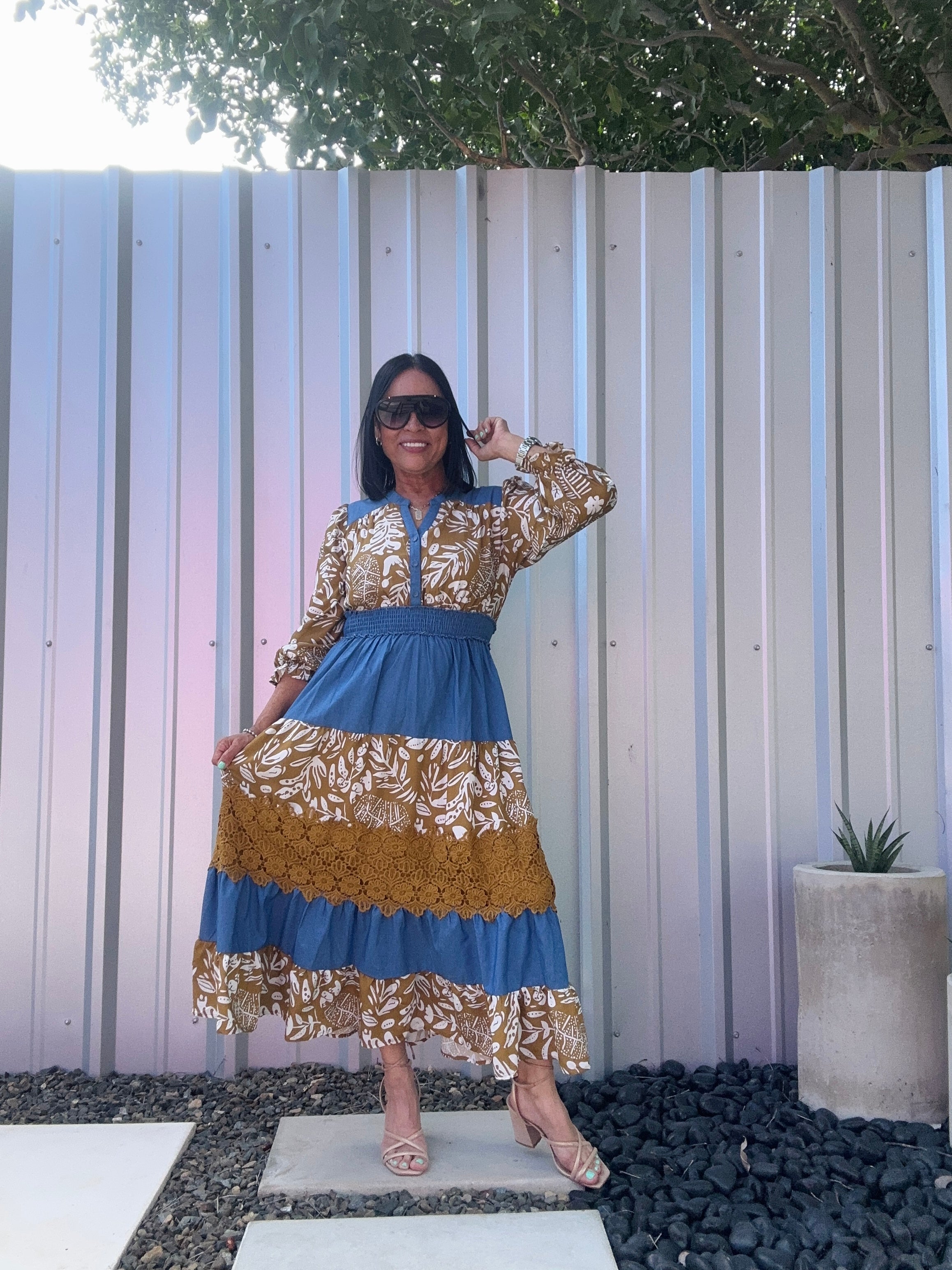 Vestido con detalle en lace y denim. Su tela es 80 % algodón y 20% polyester. Sus detalles en lace lo hacen lucir único. Tiene elástico en la cintura y en el borde de la manga.