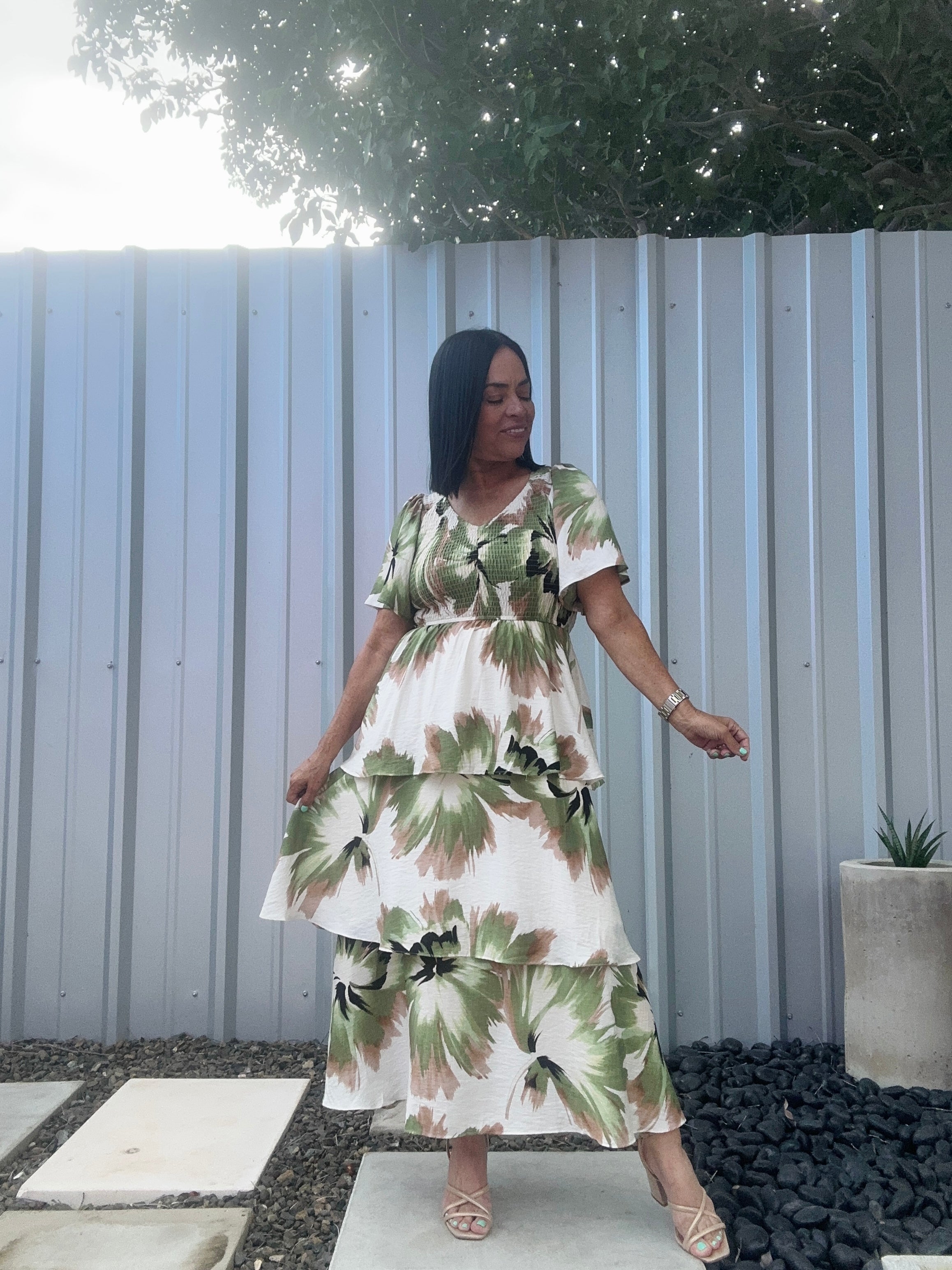 Elegante traje con elástico en la parte de pecho y espalda, volantes en la parte de la falda y vuelo en la manga. Tela 80% Rayón y 20% Nilón.