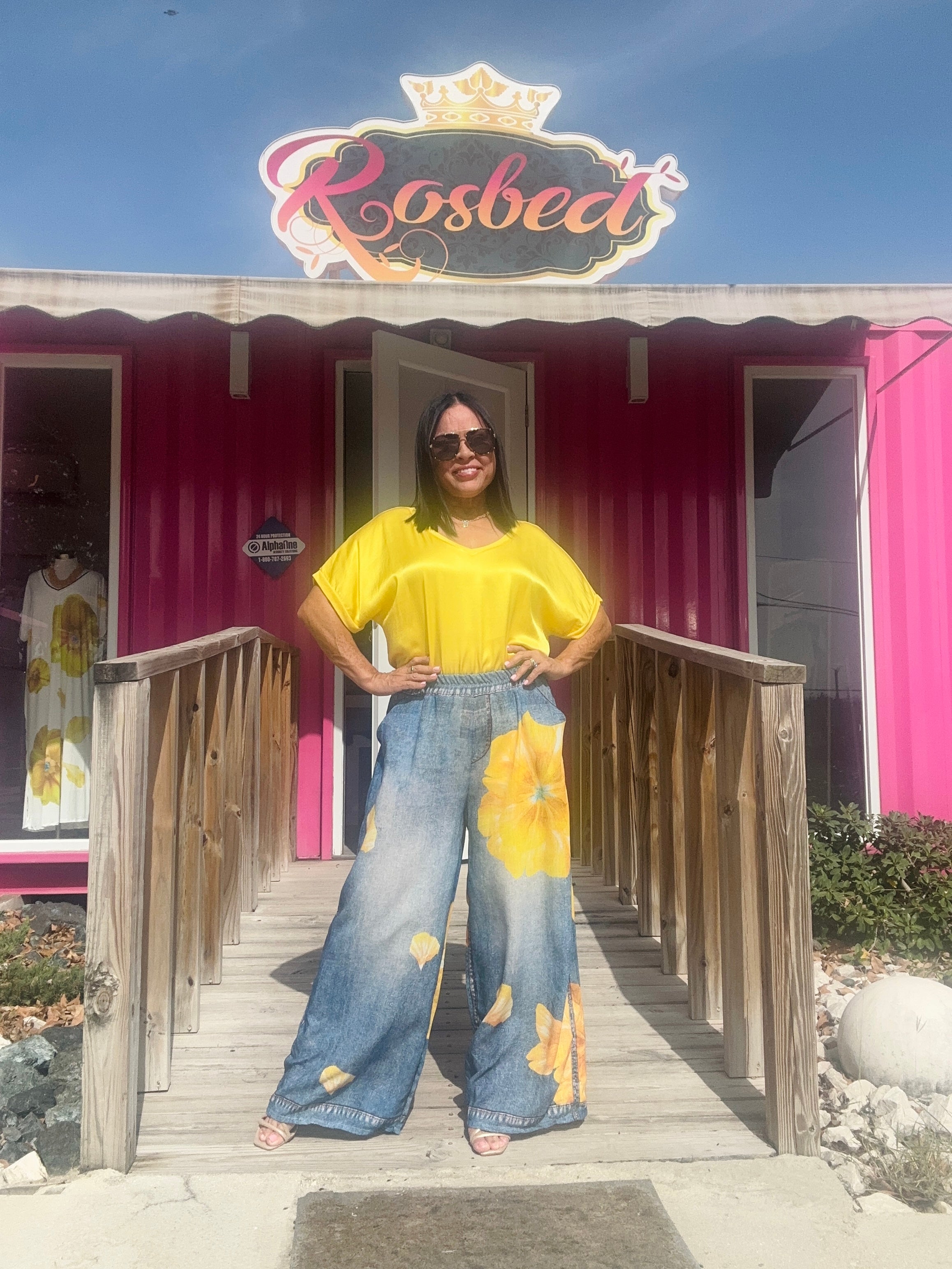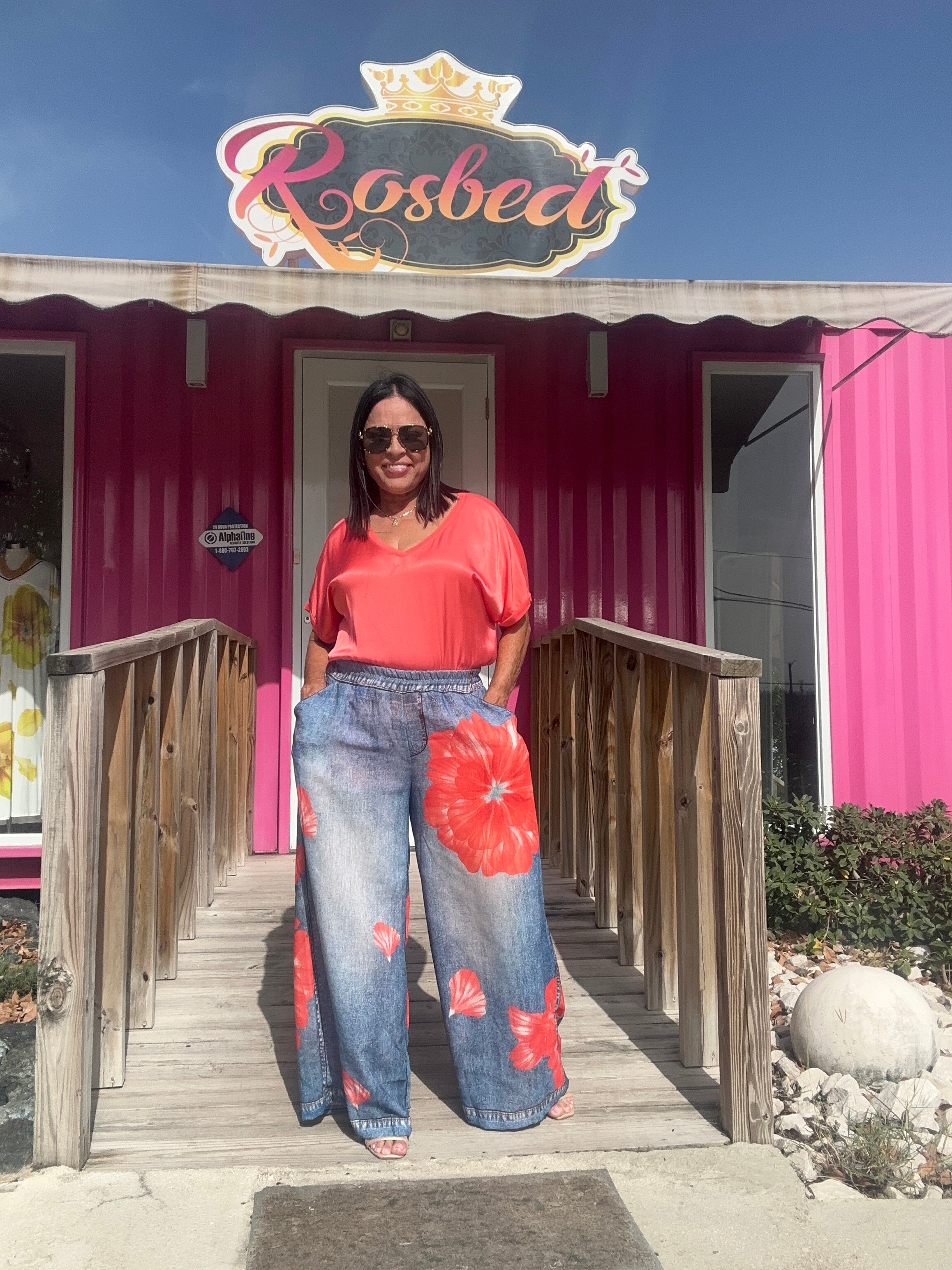 Jeans Palazzo de tela ligera y cómoda. Tiene elástico en la cintura, bolsillos y la tela es fresca. Son tallas one Size (desde Small hasta 2x )