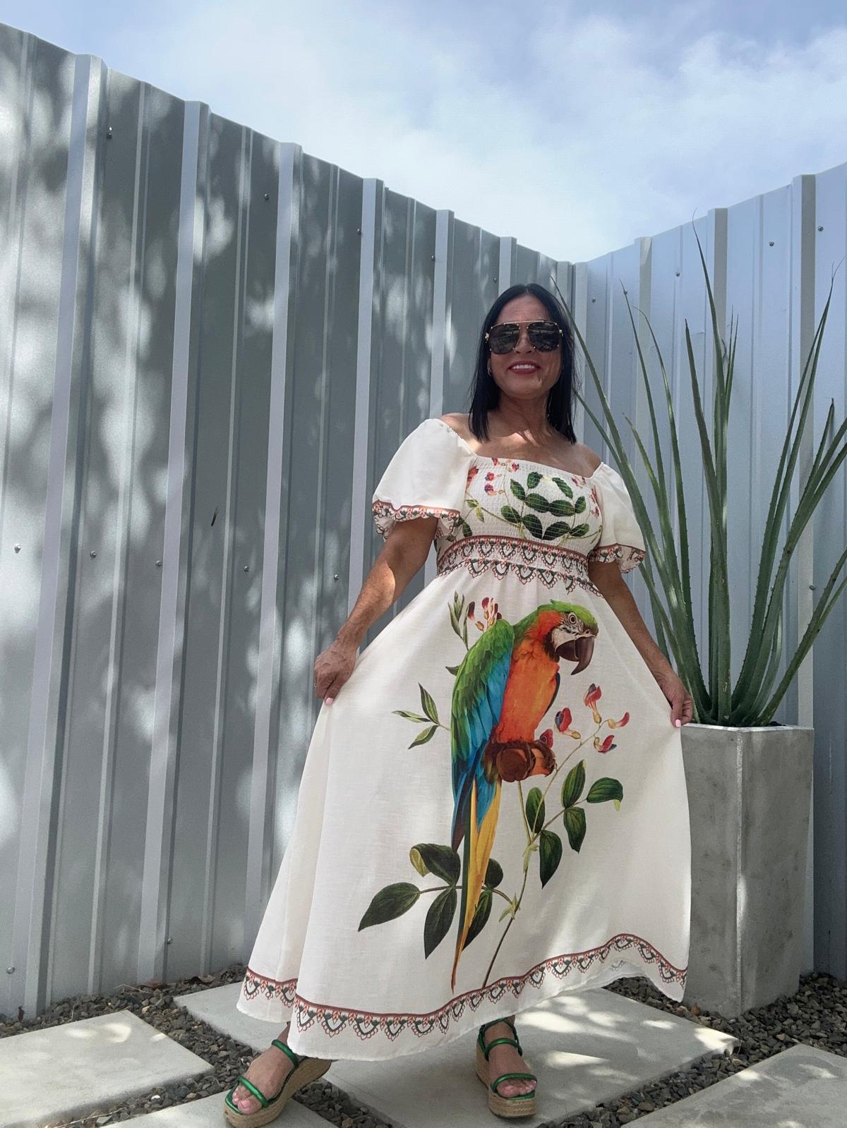 MIDI Dress summer estilo off shoulder o manga regular. Tiene elástico en la parte superior del vestido. La tela es polyester y lino. Colores tropicales y tela fresca para el verano.