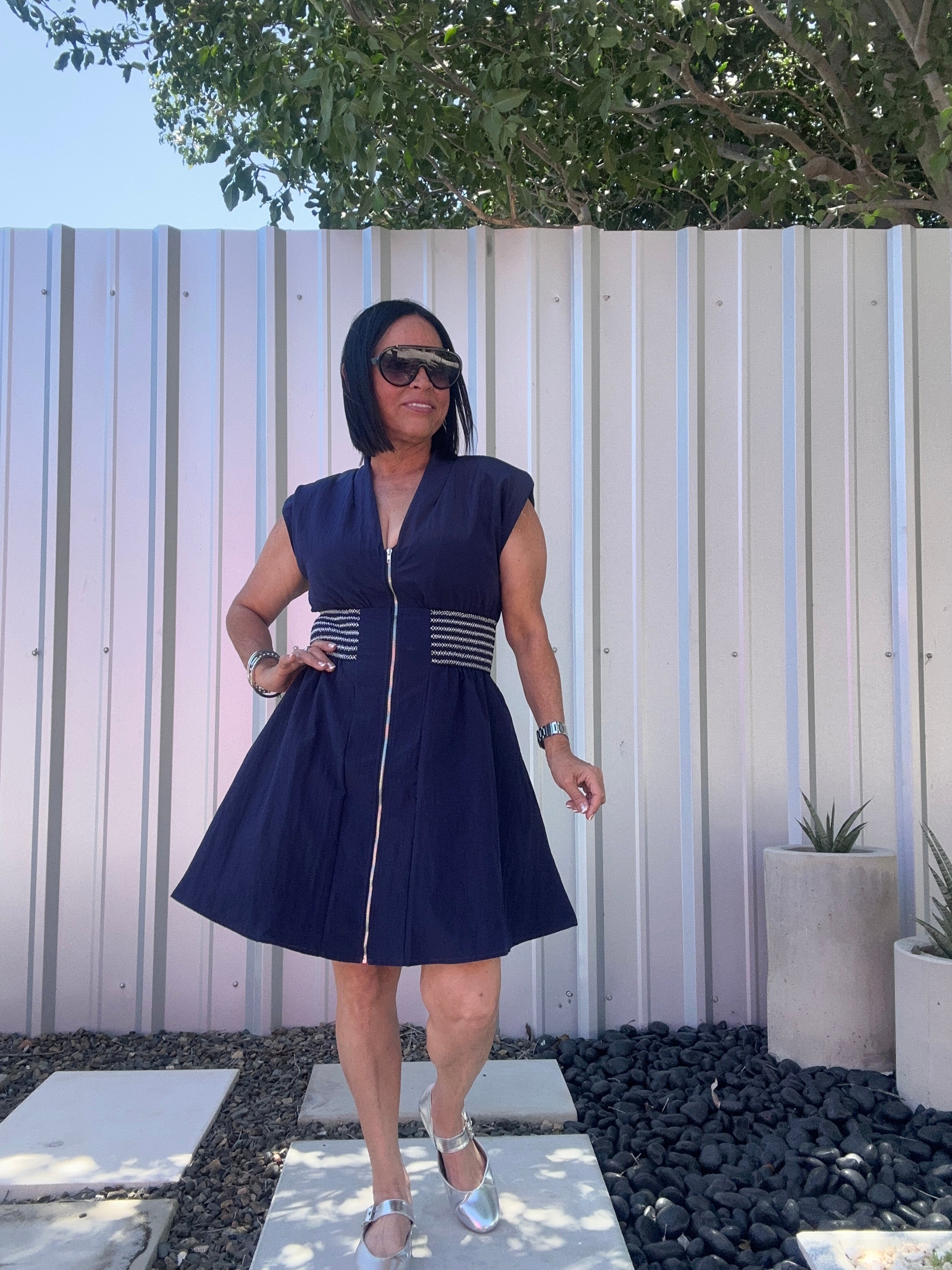 Hermoso vestido en tela 100% poliéster con banda elástica para un perfecto entalle en la cintura.Tiene zipper en toda la parte delantera de busto al largo del traje.