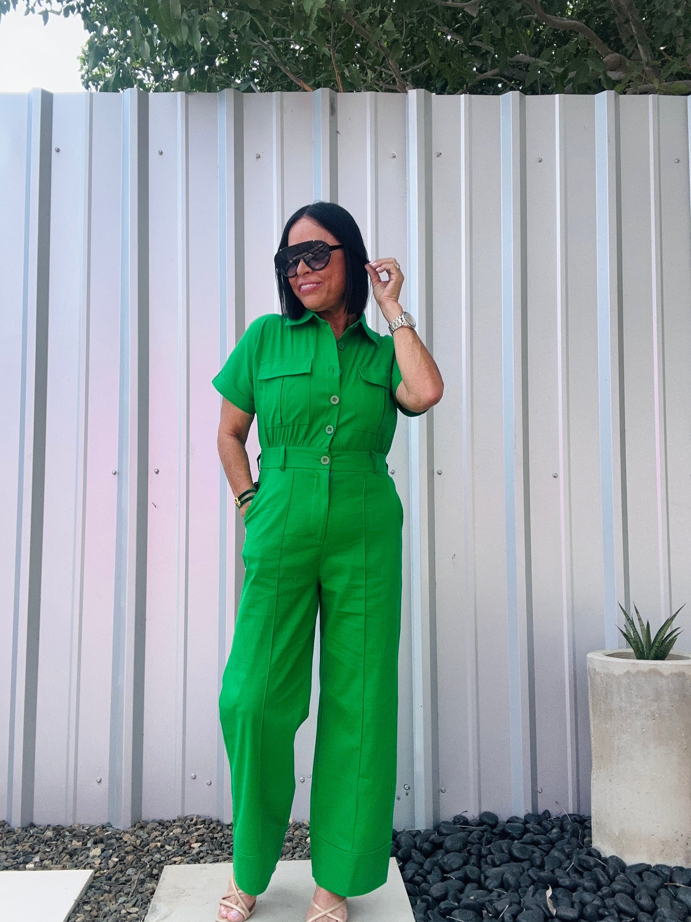 Elegante jumpsuit en color verde en tela de algodón. Cuenta con bolsillos funcionales en la parte de arriba y en el pantalón, botones y zipper. Tiene elástico en la parte de atrás de la cintura. Ideal para tu actividad casual elegante.