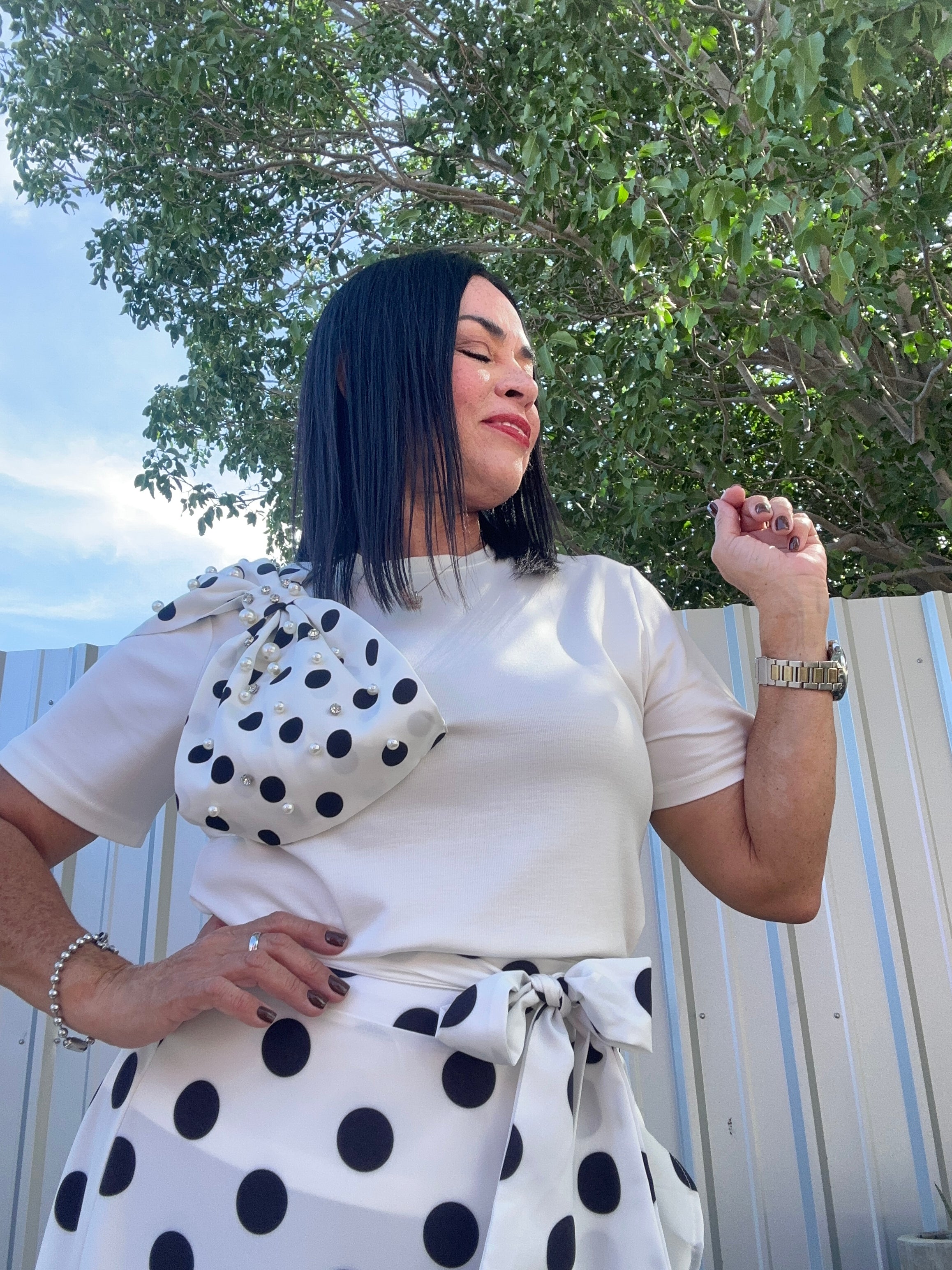 Top en polyester y spandex con lazo en Polka Dot y detalles en perlas y rainstone.
