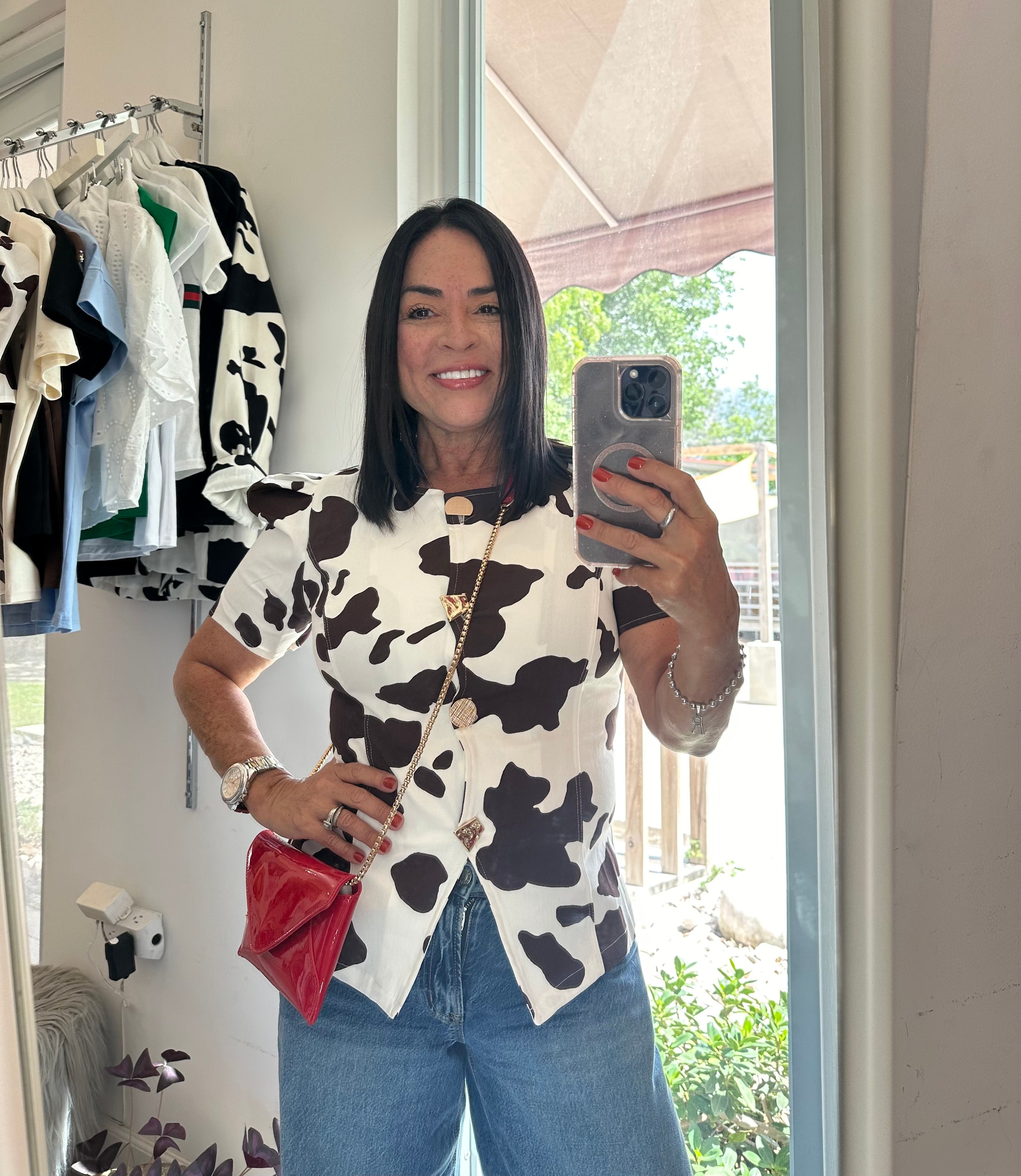 Top en diseño Cow manga corta en tela 95% algodón y 5% spandex con botones dorados.