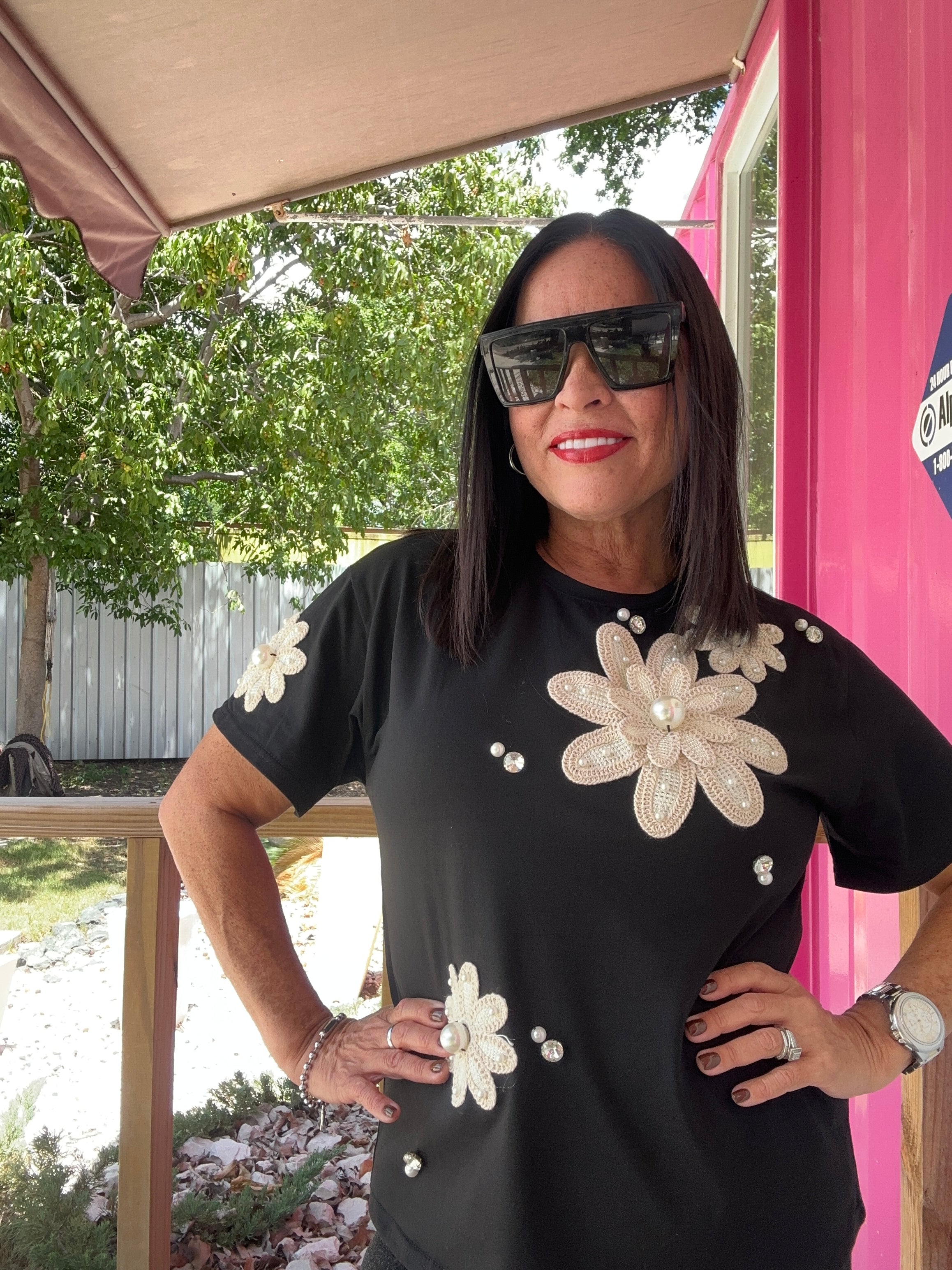 Top en tela en algodón y spandex, manga corta, flor en crochet con perlas y rainstone.